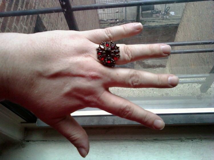 Monster skull ring, also from A Goth Shop, and my claddagh ring, which is vintage:
